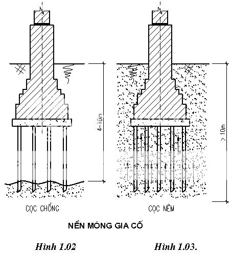 Mỗi tầng đều lấy tường ngang và tường dọc chịu lực. Sàn gác thường chịu lực theo hai phương. Có khi còn dùng hình thức phân tầng chịu lực. Loại này thường dùng cho nhà hành lang bên. 2.2. Hệ thống kết cấu khung chịu lực 2.2.1. Khung chịu lực không hoàn toàn (khung khuyết) Trong các ngôi nhà, có bước gian tương đối rộng hay mặt bằng phân chia không gian không theo một quy cách nhất định, hệ thống kết cấu của nhà có thể làm hình thức khung không hoàn toàn để chia sàn và mái. Ngoài việc lợi dụng tường ngoài để chịu lực có thể dùng tường trong hoặc cột làm kết cấu chịu lực. Hình thức này mặt bằng bố trí tương đối linh hoạt, nhưng dùng nhiều bêtông và thép hơn so với tường chịu lực, liên kết giữa tường và dầm phức tạp. ở những nơi đất yếu dễ sinh ra hiện tượng tường và cột lún không đều, ảnh hưởng đến chất lượng công trình (hình 08). 2.2.2. Khung chịu lực hoàn toàn (khung trọn) Kết cấu chịu lực của nhà là dầm và cột, tường chỉ là kết cấu bao che, do đó tường có thể dùng vật liệu nhẹ, ổn định chủ yếu của nhà dựa vào khung. Vật liệu làm khung thường làm bêtông cốt thép và thép hoặc bằng gỗ. Hình thức kết cấu này (trừ khung gỗ) ít dùng trong các nhà dân dụng bình thường vì tốn nhiều ximăng và thép, do đó chỉ nên dùng đối với nhà ở cao tầng hoặc nhà công cộng (hình 09). ![]() 2.3. Hệ thống kết cấu không gian Trong các nhà dân dụng có yêu cầu không gian lớn như rạp hát, rạp xiếc, nhà ăn, nhà thể thao có mái... ngoài các phương án kết cấu đã nêu trên ra, cũng có thể áp dụng quy luật và nguyên tắc tạo hình cấu trúc của các sinh thực vật theo phỏng sinh học kiến trúc như: - Sườn không gian ba chiều: phỏng theo cấu trúc của đầu khớp xương động vật. - Hình thức mặt xếp: phỏng theo cấu trúc của lá buông, lá dừa. - Hình thức vỏ mỏng: phỏng theo cấu trúc vỏ trứng, vỏ sò, sọ động vật. - Hình thức kết cấu dây căng: phỏng theo cấu trúc của mạng nhện. Hệ thống kết cấu chịu lực không gian thi công và cấu tạo phức tạp. Tóm lại, chọn các sơ đồ chịu lực của nhà dân dụng. Ngoài việc chú ý đến phương diện chịu lực, dễ dàng thi công và kinh tế. Về phương diện cấu tạo cần chú ý tường và mái phải có khả năng cách nhiệt và giữ nhiệt nhất định. Sàn gác và vách ngăn có khả năng cách âm cao. Hình thức cấu tạo đơn giản, các cấu kiện và vật liệu dùng rộng rãi, trọng lượng các cấu kiện không lớn quá, hợp với điều kiện thi công Chương 1 NỀN MÓNG 1.1. VỊ TRÍ, TÁC DỤNG VÀ ĐẶC ĐIỂM Nền móng là phần đất nằm dưới đáy móng chịu toàn bộ hoặc phần lớn tải trọng công trình đè xuống, còn gọi là nền đất. Căn cứ vào các lớp đất trong từng khu vực xây dựng công trình, người ta có các phương án xử lý nền móng khác nhau. Trước khi xây dựng phải tiến hành điều tra thăm dò, khảo sát, phân tích cụ thể về chất đất. Tiến hành thí nghiệm xác định cường độ chịu nén của nền đất. Để đảm bảo cho công trình không bị biến dạng, lún, nứt… thì phải thoả mãn điều kiện sau: ứng suất đáy móng (¶đm) do tải trọng công trình sinh ra nhỏ hơn hoặc bằng cường độ chịu nén của nền đất (Rnđ - Kg/cm2). 1.2. PHÂN LOẠI Có 2 loại nền móng: - Nền móng tự nhiên. - Nền móng gia cố (nhân tạo). 1.3. CẤU TẠO 1.3.1. Nền móng tự nhiên Là nền móng mà bản thân nó đã đủ khả năng chịu lực cho công trình. Khi ứng suất đáy móng (¶đm) do tải trọng công trình sinh ra nhỏ hơn hoặc bằng cường độ chịu nén của nền đất (Rnđ). Nếu điều kiện địa chất thuỷ văn đảm bảo, thì ta có thể xây dựng móng trên nền đất ấy mà không cần gia cố (hình 1.01). ![]() 1.3.2. Nền móng gia cố (nhân tạo) Là nền móng mà bản thân nó không đủ khả năng chịu lực cho công trình, lúc này ta cần gia cố cho nền móng để tăng khả năng chịu nén của nền đất. Có nhiều cách gia cố, nhưng thông thường hay dùng kiểu nền đất và nền cọc. 1.3.2.1. Nền đất: có hai biện pháp xử lý nền đất. Khi cường độ chịu nén của đất xấp xỉ bằng ứng suất đáy móng, ta tiến hành đầm chặt đất và có thể cho thêm đá, sỏi, đá dăm rồi đầm chặt lại, sau đó xây móng lên trên. Khi đất quá xấu có thể thay lớp đất xấu bằng lớp đất khác, có khả năng làm việc tốt hơn. Thường là cát to, đất có đá hoặc sỏi đầm kỹ. 1.3.2.2. Nền cọc Tác dụng của cọc là làm tăng sức chịu lực cho nền đất. Có những lực tăng cường chủ yếu như: - Lực ma sát quanh thân cọc. - Lực nén của đất tăng lên do đất bị nêm chặt. - Phản lực sinh ra ở mũi cọc. Tuỳ theo cách làm việc của mỗi loại cọc mà phân ra: • Cọc chống (cọc cột). Là loại cọc đóng xuyên qua lớp đất xấu ở trên tới lớp đất tốt, truyền tải trọng trực tiếp đến lớp đất này. Sức chống đỡ chính của loại cọc này là phản lực ở mũi cọc. Cọc cột áp dụng trong trường
