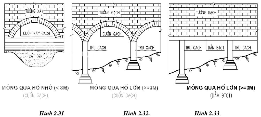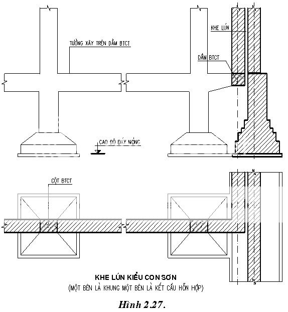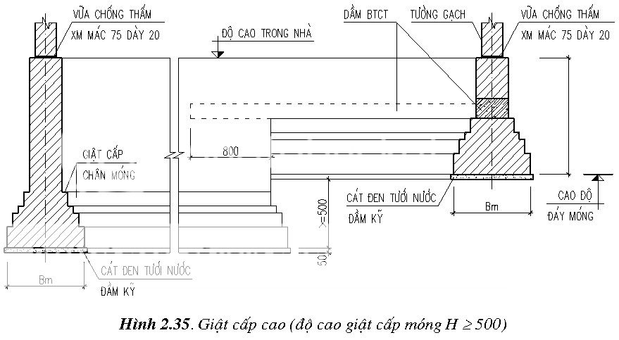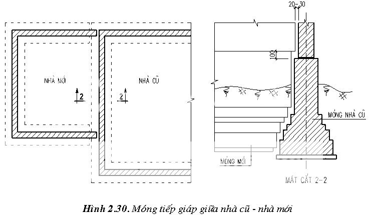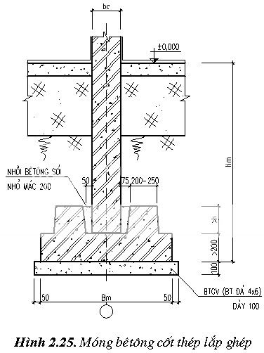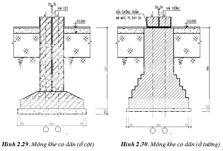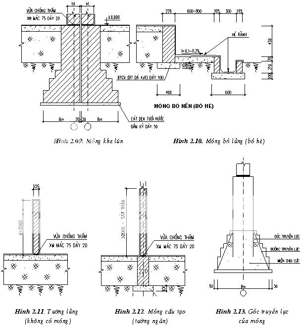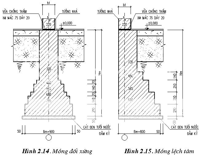 Kích thước tiết diện móng trong công trình được tính toán trên cơ sở tài liệu cơ lý nền đất, tải trọng công trình, căn cứ vào vật liệu sử dụng và dựa vào góc truyền lực vật liệu để thiết kế móng. Mỗi vật liệu có một góc truyền lực khác nhau. Ký hiệu là a (hình 2.13). - Móng gạch: a = 30° - Móng đá: a = 26 - 30° (phụ thuộc vào mác vữa xây). - Móng bêtông: a = 30 - 45° (phụ thuộc vào mác bêtông). 2.1.4.1. Móng cứng Là loại móng được làm bằng các vật liệu chịu lực nén tốt như gạch, đá, bêtông nhưng chịu uốn kém, ứng suất sinh ra là ứng suất nén đơn thuần. Tiết diện móng hợp lý là các cấp giật của móng bám sát góc truyền lực để đảm bảo khả năng chịu lực và tiết kiệm vật liệu. * Móng gạch Là loại móng phổ biến vì thích hợp kỹ thuật xây dựng phổ thông và sử dụng loại vật liệu rẻ tiền, có nhiều ở các địa phương. Móng gạch được sử dụng hợp lý khi chiều rộng đế móng nhỏ hơn 1500. Dùng gạch đặc ≥ mác 75, có kích thước tiêu chuẩn 220 ´ 105 ´ 60. Để phù hợp với kích thước viên gạch mạch vữa liên kết đứng và ngang dầy 10. Đế móng thường được xây 3 lớp gạch dày 210. ở nơi khô ráo thì có thể làm bằng bêtông gạch vỡ hoặc bêtông đá dăm dầy 150 - 300, mác 50 - 100 (thường dày 200). Đáy lót cát đầm chặt dày 50 -100 hoặc đổ bêtông gạch vỡ dầy 100, mác 50. Khi thiết kế móng ta cần có các số liệu: - Chiều rộng đáy móng: Bm. - Chiều cao móng: Hm. - Chiều dày tường: bt. Móng đối xứng: khi thiết kế móng đối xứng cần lưu ý các cấp giật (hình 2.14). Chiều rộng: cấp dưới bằng cấp trên cộng 115. (115 = 105 + 10). Chiều cao: là bội số của 70 để chẵn gạch (70 = 60 + 10). Các bậc giật thông thường: 70 - 140-…-70 - 140 - 210. ![]() Móng lệch tâm: khi thiết kế móng lệch tâm cần lưu ý các cấp giật (hình 2.15). Chiều rộng: cấp dưới bằng cấp trên cộng 115. (115 = 105 + 10). Chiều cao: là bội số của 70 để chẵn gạch. (70 = 60 + 10). Các bậc giật thông thường: 140 - 210 - 210 -...- 210. Móng đá Là loại móng phổ biến trong nhà dân dụng thấp tầng, nhất là tại các địa phương có nhiều đá. Do kích thước của đá không đều nhau cho nên bề dày của cổ móng ≥ 400, đối với móng cột bề dày của cổ móng ≥ 600. Chiều rộng bậc giật bằng 1/2 chiều cao bậc giật (b/h = 1/2), chiều cao bậc giật thường lấy từ 350 - 600 (hình 2.16 - 2.17 - 2.18). ![]() Khi xây cần chú ý các mạch vữa ngang phải cùng nằm trên một mặt phẳng ngang, tránh đá chèn nhau khi chịu lực, mạch vữa đứng không được trùng nhau để tránh bị nứt theo chiều đứng, đá cong và dài không được dùng vì dễ bị gãy, gặp đá lõm thì đặt chiều lõm xuống dưới để viên đá ổn định, mạch vữa không nên dầy quá (với đá hộc mạch vữa xây là 30, với gia công mạch vữa xây là 10). * Móng bêtông: Là loại móng dùng ximăng làm vật liệu liên kết với các cốt liệu khác như đá dăm, sỏi, cát, gạch vỡ… tạo thành. Có thể sử dụng cho nhà có tải trọng lớn hoặc móng sâu. Đối với móng bêtông có thể tích lớn (như móng của nhà công nghiệp), có thể thêm đá hộc vào bêtông, gọi là bêtông đá hộc. Tổng thể tích đá hộc có thể chiếm 30 - 50% thể tích móng. Kích thước mỗi viên đá hộc không được quá 1/3 chiều rộng móng, đường kính không lớn hơn 300, khoảng trống giữa các viên đá hộc không nhỏ 40. Móng thường có dạng hình thang hoặc giật cấp (hình 2.19 - 2.20). ![]() 2.1.4.2. Móng mềm Là loại móng được làm bằng bêtông cốt thép, có khả năng chịu uốn tốt (bao gồm kéo, nén). áp dụng cho công trình có tải trọng lớn, nhà nhiều tầng, ở nơi đất xấu. Để tiết kiệm có thể chỉ đổ bêtông cốt thép phần thân móng, còn phía trên xây gạch hoặc đá. Làm phẳng đáy móng bằng cát đầm chặt dầy 50 - 100, bêtông gạch vỡ dầy 100, mác 50 hoặc bêtông đá 4´6 mác 100 (hình 2.21 - 2.22 - 2.23 - 2.24 - 2.25). ![]() ![]() ![]() 2.1.5. Các vị trí đặc biệt của móng 2.1.5.1. Móng khe lún: khe lún chia công trình ra làm các phần độc lập từ móng đến mái để đề phòng lún không đều gây phá hoại công trình. ở vị trí khe lún, móng và tường phải tách ra và chiều rộng khe hở lún thường là 20 - 30 (hình 2.26 - 2.27 - 2.28). Vị trí khe lún thường được đặt ở các vị trí: - Khi chiều dài nhà trên 40m. - Công trình chịu tải trọng chênh lệch. - Nền đất yếu, có độ lún khác nhau. - Thời gian xây dựng khác nhau. Mặt cắt 1-1 Khe lún kiểu thông thường Hình 1.26 ![]() 2.1.5.2. Móng khe co dãn (khe nhiệt độ) Do nhiệt độ thay đổi làm cho nhà có thể bị dãn nở. Những công trình dài cần phải làm các khe co dãn để tường, sàn, mái có thể dãn nở tự do được. Khe co dãn phân công trình thành các phần từ phần trên của móng đến mái. ở khe co dãn tại vị trí móng được làm chung, nhưng tại vị trí tường phải tách ra và chiều rộng khe co dãn thường là 20 - 30. Khoảng cách giữa các khe co dãn tuỳ theo loại kết cấu và vật liệu, từ 15 -