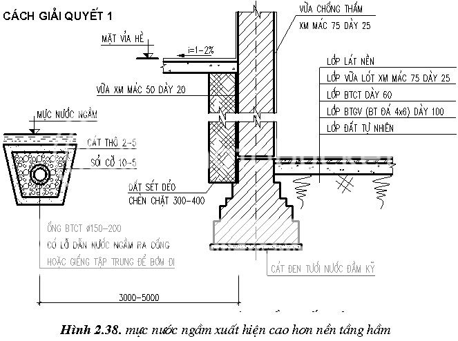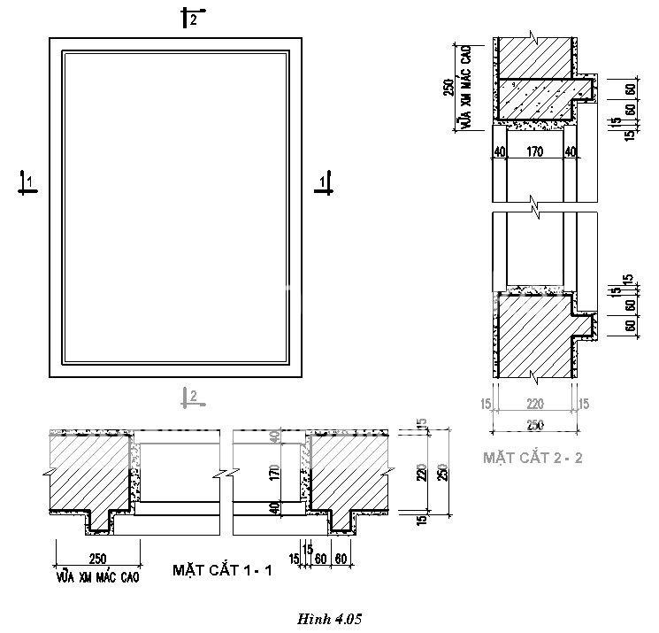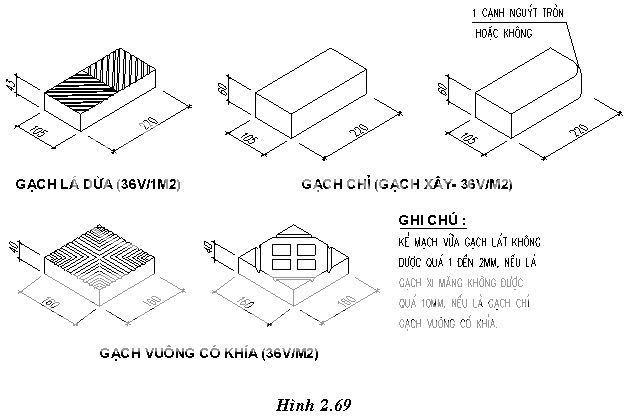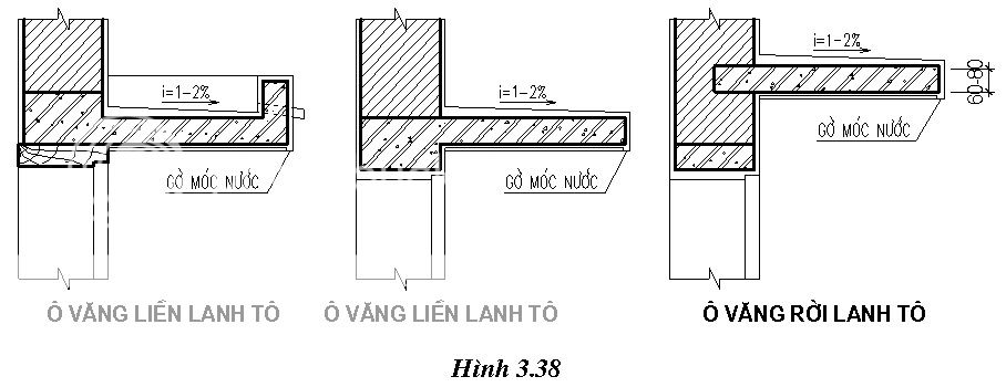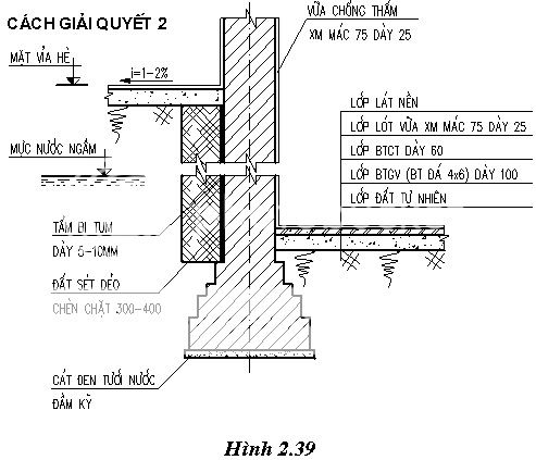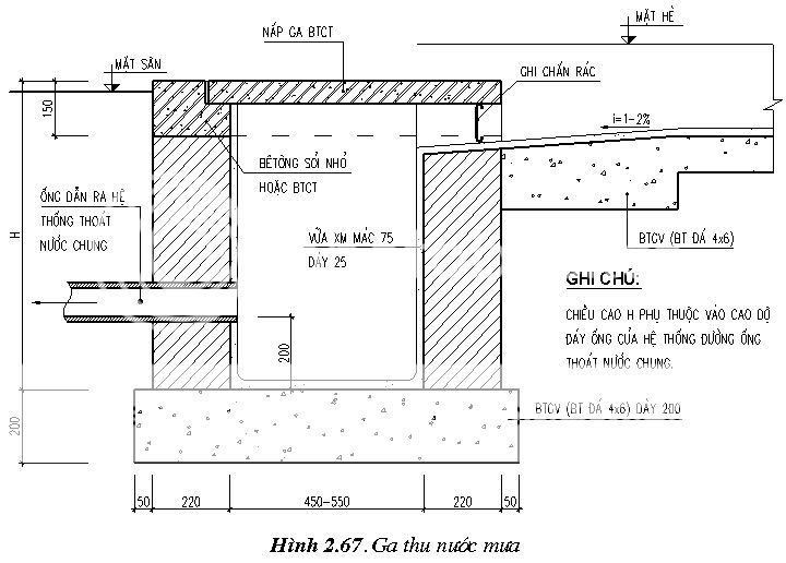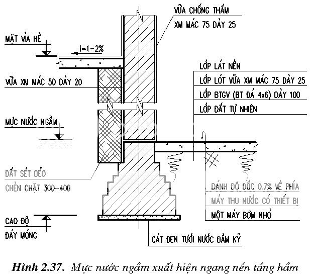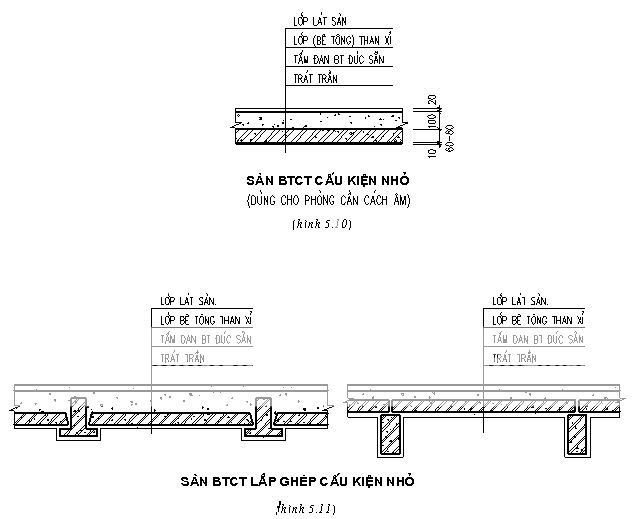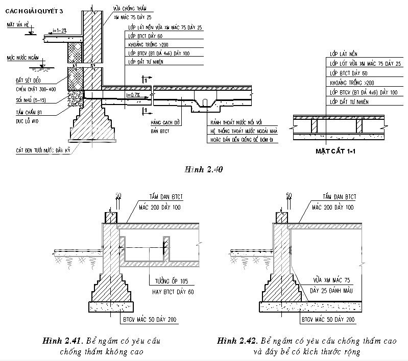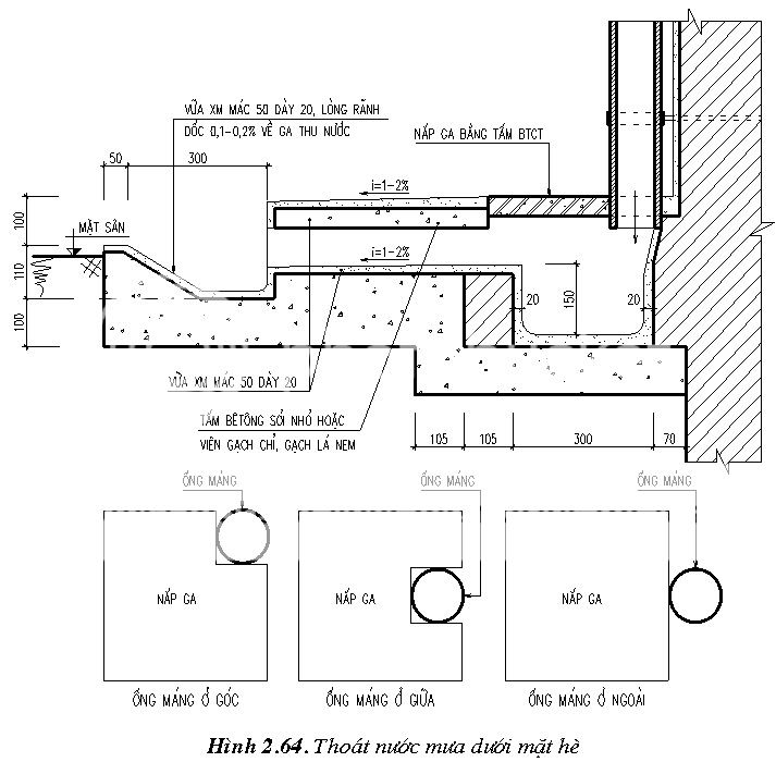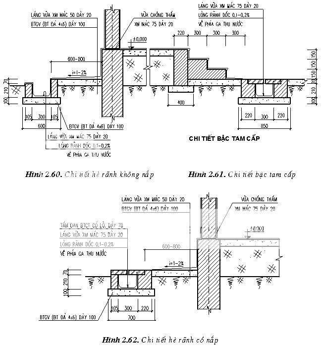 2.2.1. Nền nhà 2.2.1.1. Độ cao Thông thường nền nhà cao hơn mặt đất thiết kế để tránh ngập nước và ẩm thấp. Độ cao phụ thuộc vào qui mô, tính chất và yêu cầu của từng công trình, phụ thuộc vào qui hoạch chung của khu vực, nhưng tối thiểu nền nhà phải cao hơn mặt đất phía ngoài là 300. Nền nhà một tầng tối thiểu cao hơn 300. Nền nhà nhiều tầng tối thiểu cao hơn 450. 2.2.1.2. Cấu tạo nền nhà Bao gồm các lớp cấu tạo: lớp mặt nền, lớp chịu lực, lớp đất tôn nền và lớp đất tự nhiên. Lớp mặt nền: có tác dụng làm sạch, đẹp cho nền nhà. Có thể lát hoặc láng (hình 2.53 - 2.57). - Láng vữa ximăng mác 75, dày 20, có thể đánh màu hoặc không đánh màu bằng ximăng nguyên chất. - Lát gạch Bát Tràng (lá nem), có kích thước 200 ´ 200 ´ 20 hoặc 300 ´ 300 ´ 10, lót vữa mác 50, dầy 30, mạch vữa dầy 10. - Lát gạch ximăng, có kích thước 200 ´ 200 ´ 20, lót vữa ximăng mác 50, dày 30, miết mạch bằng ximăng nguyên chất dày từ 1-2mm. - Lát gạch granitô, có kích thước 200 ´ 200 ´ 20, lát như gạch ximăng. - Lát gạch chỉ 220 ´ 105 ´ 60 có thể vỉa nghiêng hay đặt phẳng. Lót vữa ximăng 50, dầy 20-25, mạch vữa dày 10. - Láng granitô, vữa trộn bằng đá hạt lựu với bột màu và ximăng trắng. Có thể làm nhiều màu khác nhau. Ngoài ra mặt nền có thể lát gạch hoa cao cấp với nhiều kích thước hoặc lát đá xẻ, gỗ … Lớp chịu lực: có tác dụng chịu lực cho nền nhà. Thường là bêtông đá dăm hoặc bêtông gạch vỡ vữa tam hợp mác 50-75, dày 100-200, trường hợp đặc biệt có thể dùng bêtông cốt thép. Lớp đất tôn nền: có tác dụng tôn cao nền nhà đến độ cao thiết kế. Có thể dùng đất sét, đất sét pha cát đổ từng lớp dày từ 150-200 hoặc cát đen, tưới nước đầm kỹ (vết đầm sau trùng vết đầm trước 1/2 mặt đầm). Trước khi đầm cần phải dọn sạch rác, các loại cỏ, gốc cây, mùn rác... để chống sụt nền và phòng mối. Lớp đất tự nhiên: trùng với mặt đất thiết kế ở cao độ tiêu chuẩn. 2.2.2. Hè rãnh Xung quanh nhà thường làm vỉa hè để đi lại, vỉa hè còn có tác dụng tránh sói lở, làm gọn, làm sạch, tăng vẻ đẹp của nhà. Rãnh có tác dụng thu nước mưa, nước sinh hoạt của công trình. Hè có thể có rãnh hoặc không có rãnh. Mặt hè dốc 1-2% về phía rãnh thu nước. Rãnh có thể có nắp đậy hoặc không có nắp đậy. Rãnh có thể xây gạch, cũng có thể đổ bêtông gạch vỡ rồi láng vữa ximăng. Lòng rãnh dốc 0,1- 0,2% về phía hố ga thu nước (hình 2.58 - 2.69). ![]() ![]() ![]() ![]() ![]() ![]() ![]() ![]() ![]()